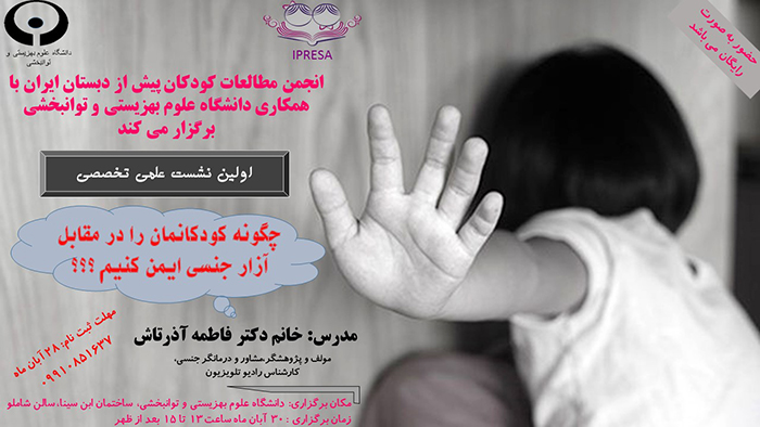 اولین کارگاه علمی تخصصی پیرامون سلامت و رشد کودکان  با موضوع  " تربیت جنسی کودکان "، روز چهارشنبه  (30 آبان ماه جاری) به همت انجمن مطالعات کودکان پیش از دبستان ایران و انجمن علمی دانشجویی کودکان  پیش از دبستان و با همکاری گروه آموزشی رشد و پرورش کودکان پیش از دبستان دانشگاه علوم بهزیستی و توانبخشی  برگزار می شود.