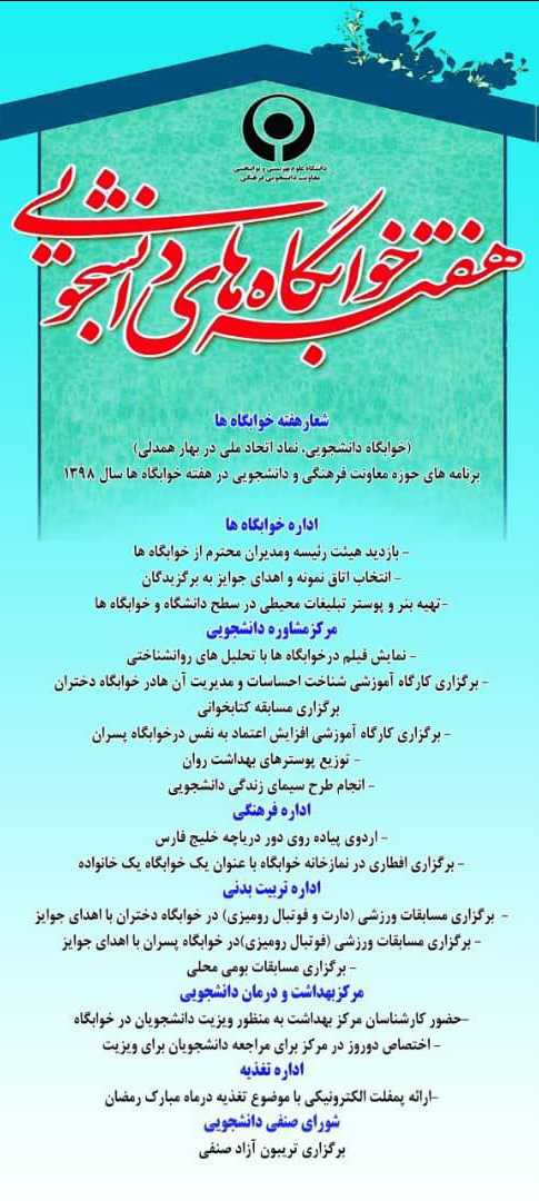 اقدم، افزود: برپایی سفره‌های افطاری و انتخاب اتاق نمونه در خوابگاه‌های دانشجویی، و بازدید دانشجویان از دریاچه شهدای خلیج فارس، نیز از دیگر برنامه های هفته خوابگاه ها بود که با همکاری مدیریت فرهنگی دانشگاه اجرا شد.