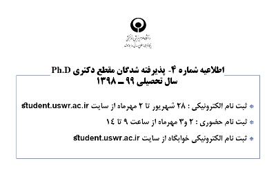 اخبار > اطلاعیه شماره 4ـ پذیرفته شدگان مقطع دکتری Ph.D - سال تحصیلی 99 ـ 1398