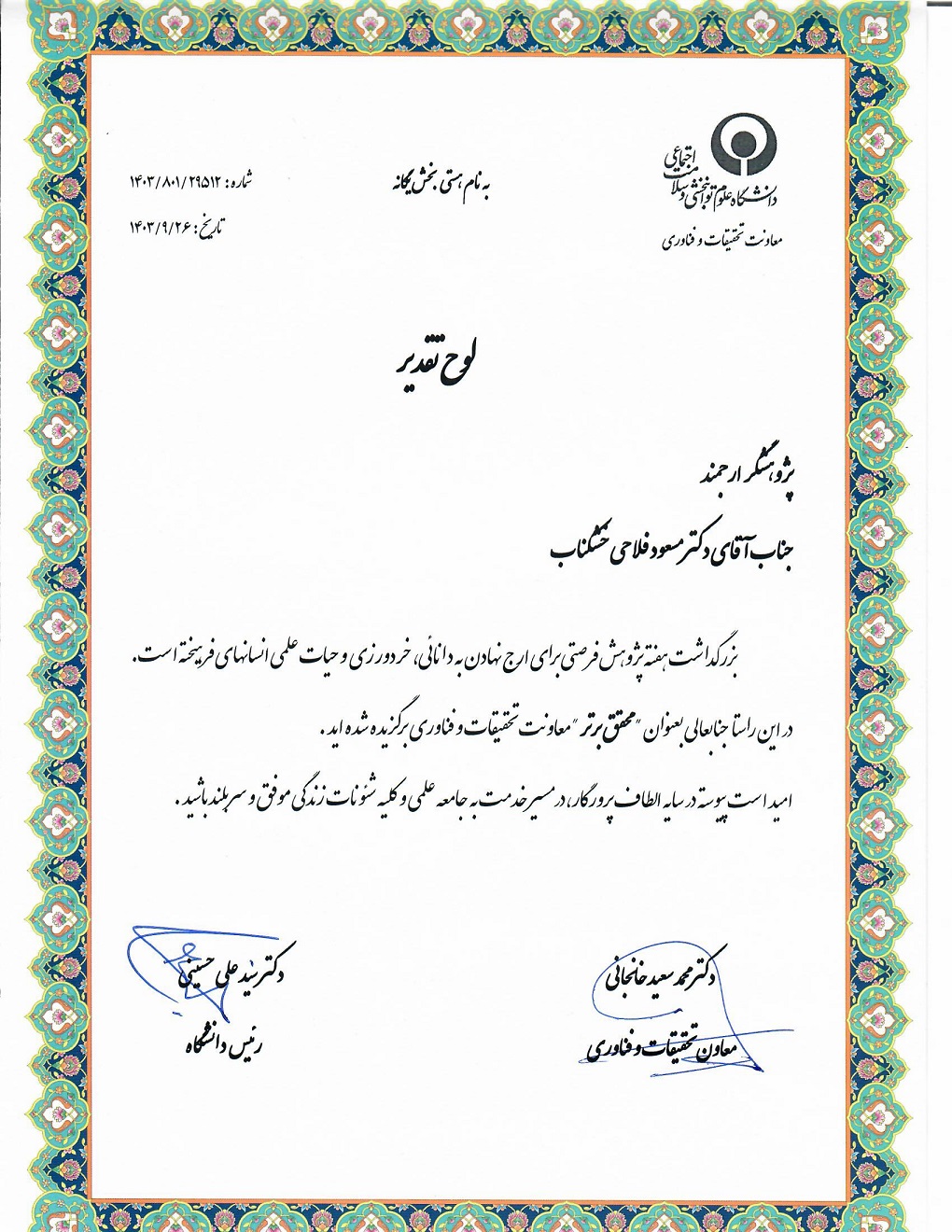 انتخاب آقای دکتر فلاحی به عنوان محقق برتر دانشگاه